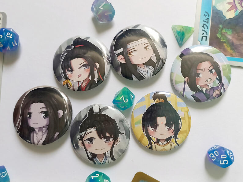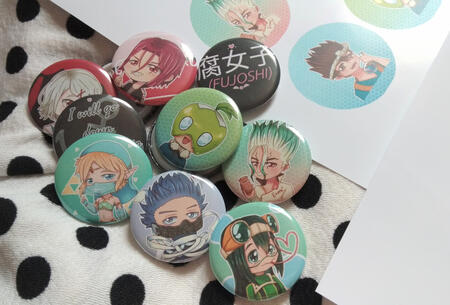 Posters/Prints, badges, enamel pins, keychains, earrings, stickers, pocket mirrors, with possibly more to come.Below is a practice stall set up, as well as my set up for a half-table at GLORP 2024 and the Twilight Kaigacon in 2025.